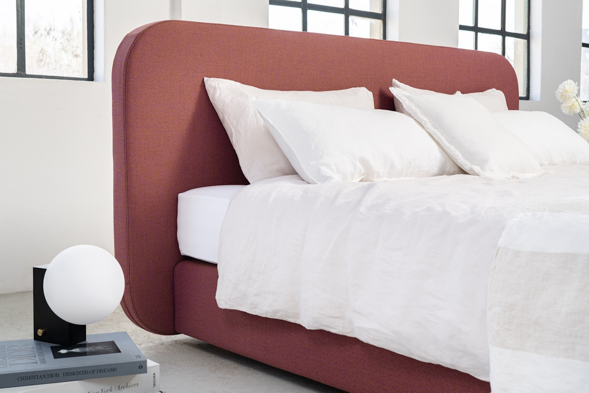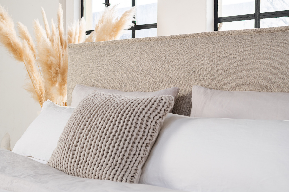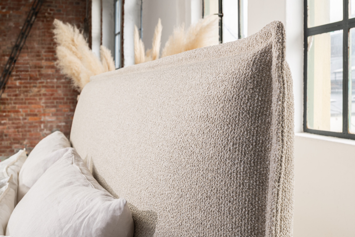 Die Rundungen des Kopfteils und die flache Boxspringunterfederung verleihen dem Design eine minimalistische Optik. Das Boxspringbett verbindet zeitloses Design mit moderner Leichtigkeit. In dieser Ausführung mit einem edlem Bouclè-Stoff bezogen wird das Bett zum stilvollen Mittelpunkt des Schlafzimmers.