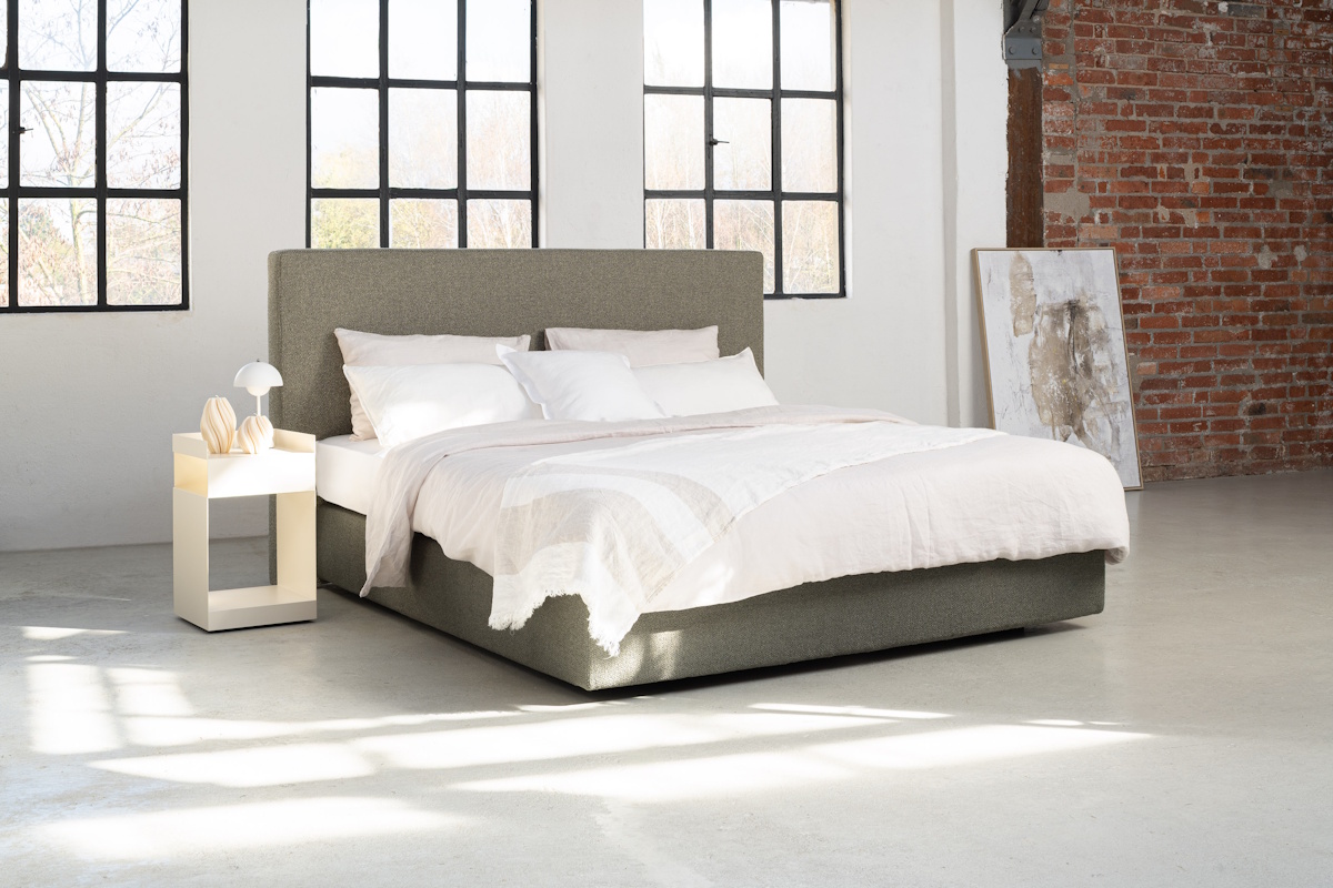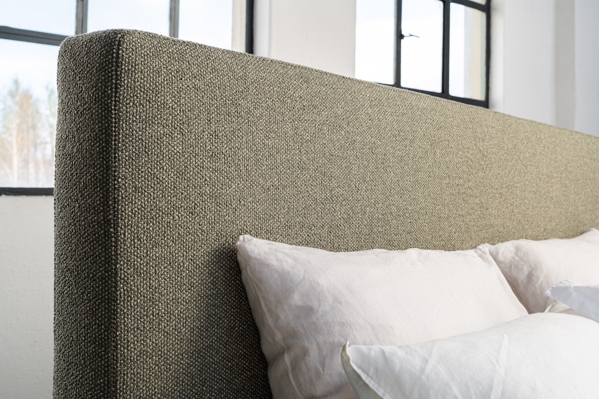 Klare Linien. In dieser Ausführung überzeugt das Boxspringbett Milano durch sein schlichtes Kopfteil und den hochwertigen Bouclé-Stoff in Olivgrün. Der Stoff des Kopfteils setzt sich bewusst vom Unifarbenen Stoff der Unterfederung ab - beide Grüntöne entstammen jedoch derselben Farbfamilie.
