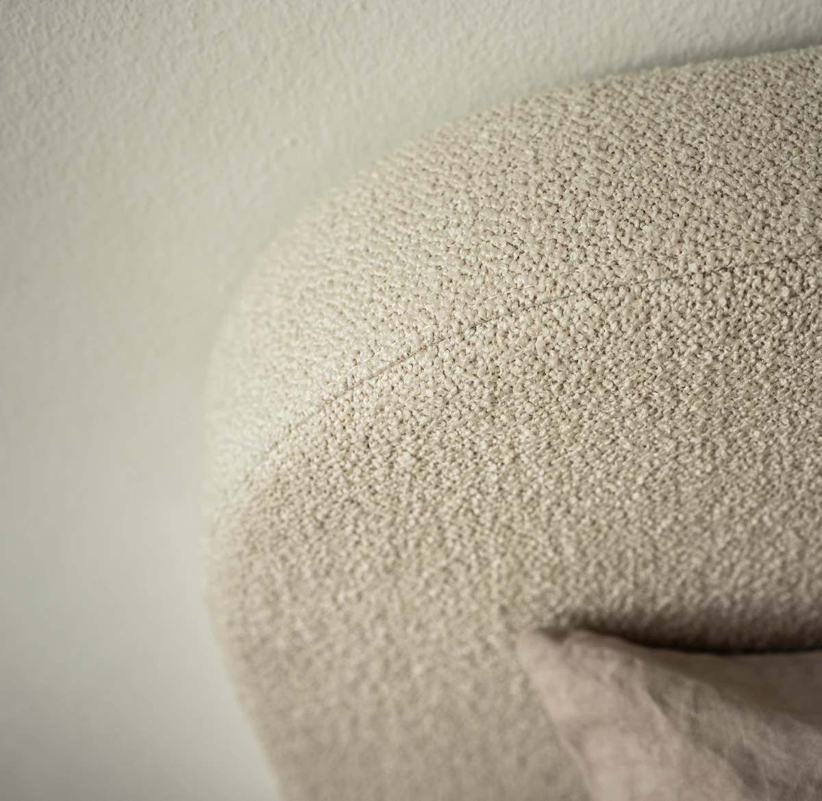 CONG4-Boxspringbett mit modernem Kopfteil aus hochwertigem Bouclé-Stoff.